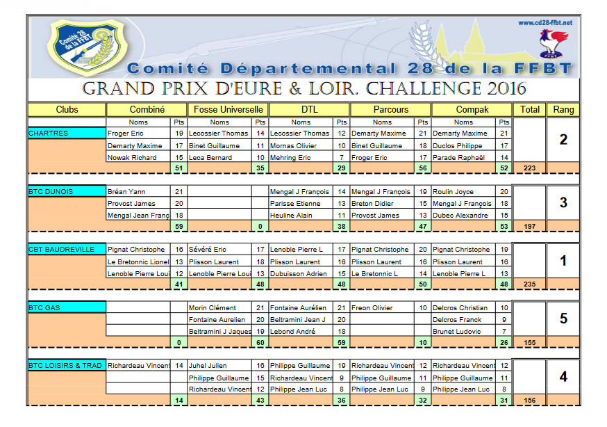 Le résultat du challenge des clubs est tombé et le Ball Trap Club Chartrain termine 2ème derrière le Club de Baudreville et devant le Ball Trap Club du Dunois !!