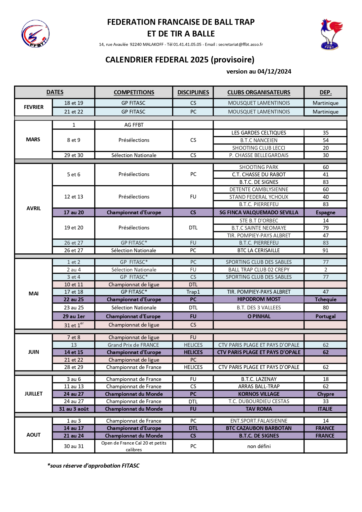 Calendrier des compétions 2025
