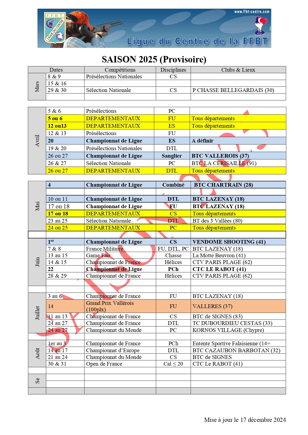 Calendriers des competitions 2025